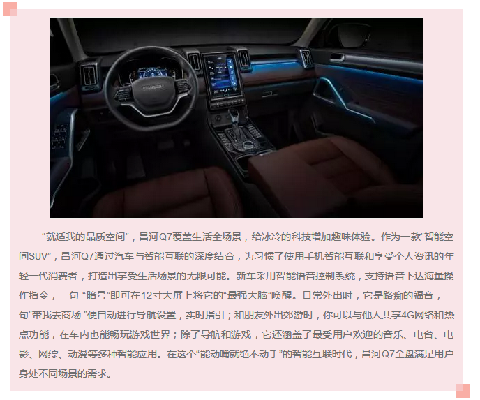 昌河Q7定位為“智能空間SUV“,為充滿活力的,喜歡表達(dá)自我、享受當(dāng)下,更渴望嘗試新鮮事物的年輕一代消費(fèi)者量身打造,新車打出“就適我的空間”這一鮮明產(chǎn)品主張,旨在為互聯(lián)網(wǎng)下的新世代年輕人創(chuàng)造一部能夠滿足日常通勤、商務(wù)、娛樂(lè)等全場(chǎng)景需求的全能產(chǎn)品。