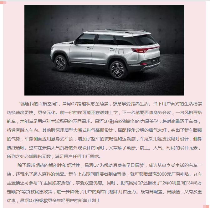 面對(duì)時(shí)代變革的新趨勢(shì),昌河汽車以用戶需求為原點(diǎn),以移動(dòng)出行辦公需求和移動(dòng)出行娛樂(lè)需求為突破點(diǎn),打造出了一系列重點(diǎn)車型。昌河汽車“敢創(chuàng)同行”戰(zhàn)略發(fā)布會(huì)同步上市全新車型——北汽昌河Q7,是其2018年新戰(zhàn)略方向下的重磅戰(zhàn)略車型。