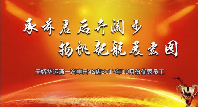 銀色的十月已過(guò)去,輝煌的十一月悄然來(lái)臨,時(shí)間晃晃而過(guò)已是2017年11月11日,天嬌華運(yùn)通一汽豐田4S店每月一次的總結(jié)優(yōu)秀員工表彰大會(huì)如期而至。