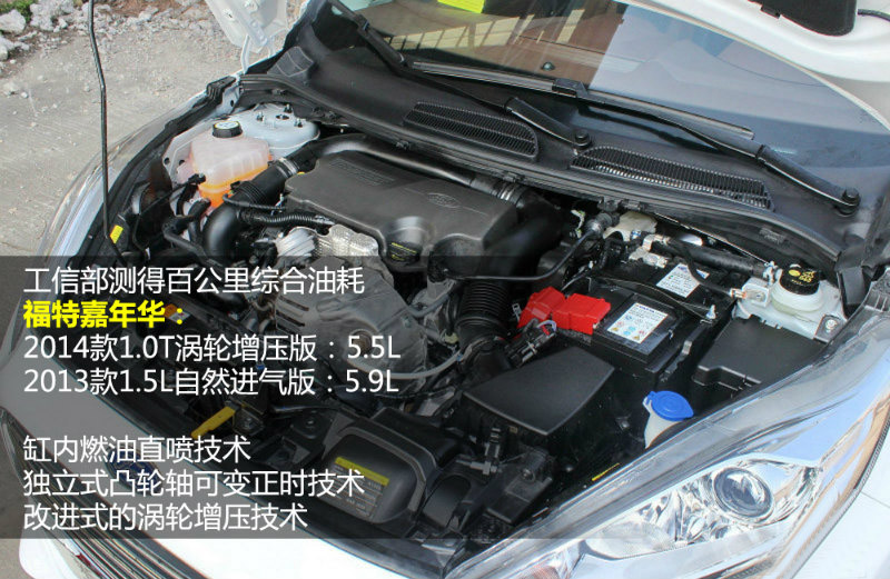 標配1.0T渦輪增壓動力引擎2014款福特嘉年華工信部測得百公里綜合油耗5.5L,而2013款1.5L自然進氣發(fā)動機嘉年華工信部給出的油耗數(shù)據(jù)為5.9L/100km??梢姡们也徽摴ば挪康挠秃臄?shù)據(jù)有多偏離實際情況,至少1.0T發(fā)動機油耗相對還是要比1.5L發(fā)動機低。具體原因主要有以下三點:缸內(nèi)燃油直噴技術、獨立式凸輪軸可變正時技術、以及改進式的渦輪增壓技術。